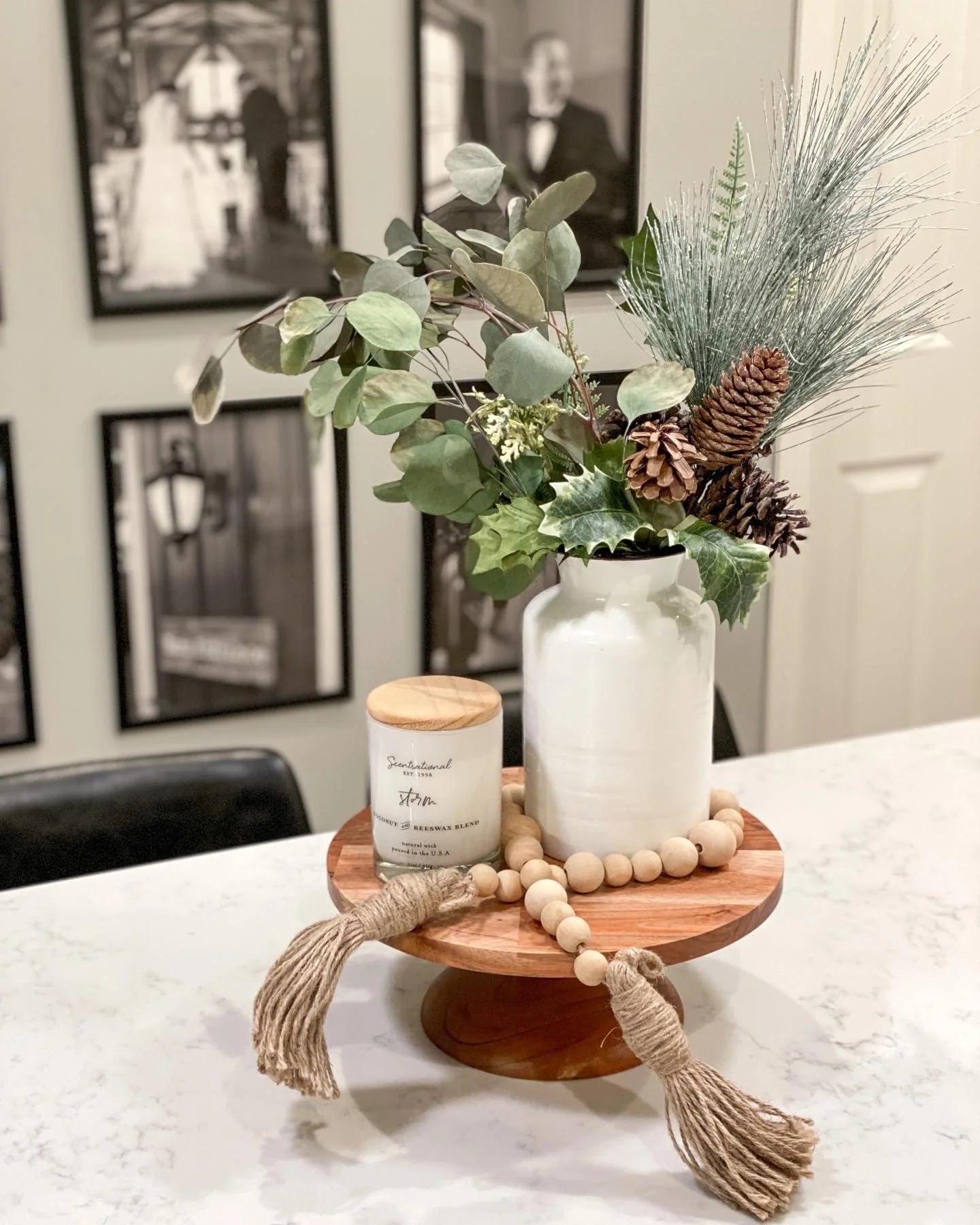 I ended up using the same materials for my kitchen island centerpiece but did one very simple change. The GREENERY and VASE! That’s it! I wanted to use the same centerpiece because honestly, I love it. It’s super simple and easy to move when we have guests over. I went with a simple white vase and found some winter greenery on Amazon. It added exactly what I wanted! Just enough to show me it was winter :) If you are wanting some color, try red berries to add the pop you may be looking for.